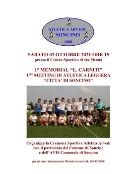 Sabato 2 ottobre si svolgerà a Soncino il 17° Meeting "Città di Soncino", valido come 1° Memorial "Luigi Carniti". Vi ricordiamo che le iscrizioni vanno fatte SOLO on line ENTRO LE ORE 22.00 DI MARTEDI' 28 settembre 2021 e che per entrare nell'impianto serviranno autodichiarazione Covid 19 e Green Pass.
